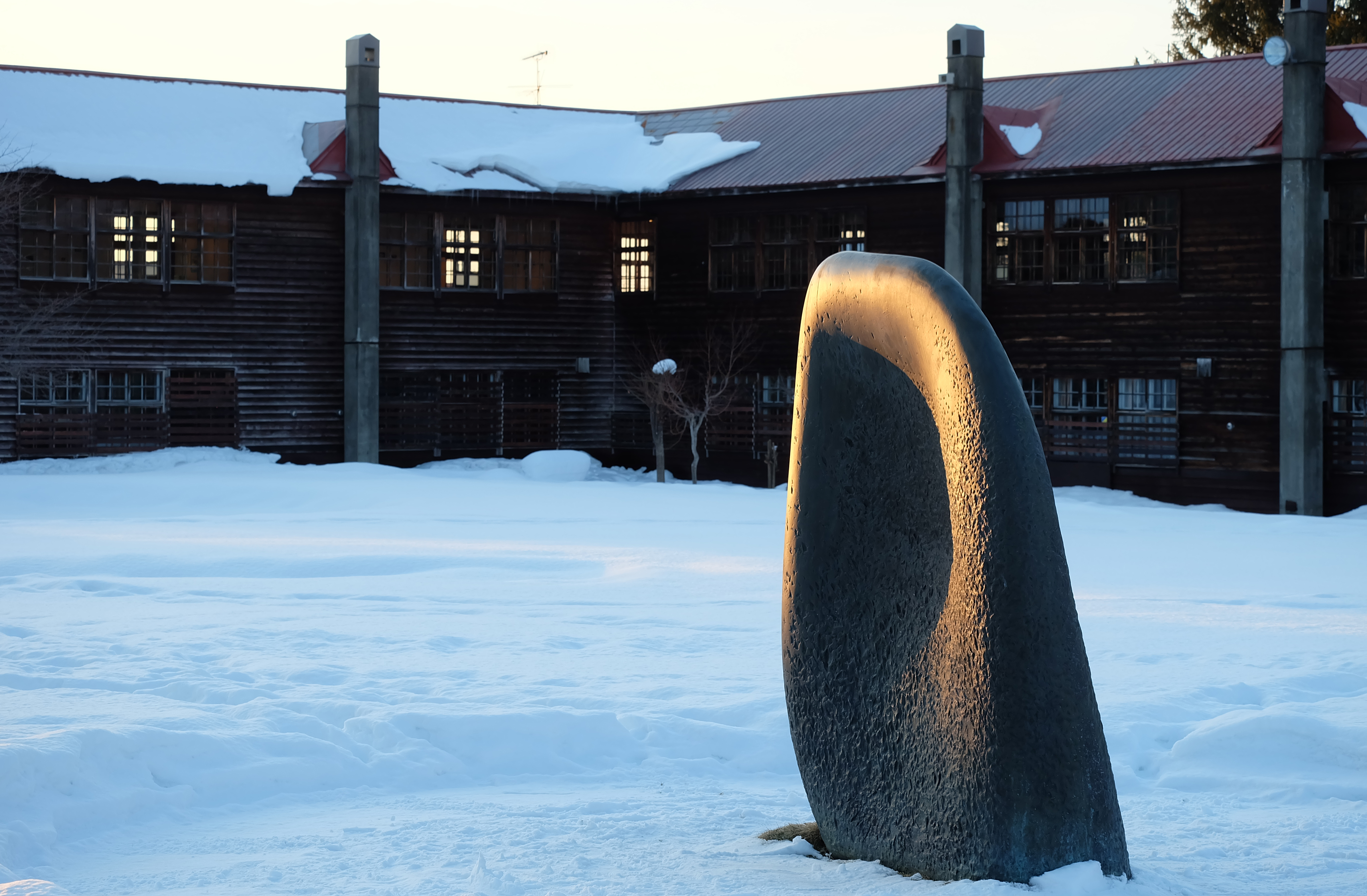 晴れた日の夕方は、彫刻がきれいな西日に照らされて刻々と表情を変えます。このところ、「雪の時期に来たかった」と道外から来訪され、お昼ごろから夕日の時間までゆっくりと滞在してくださる方が続いています。